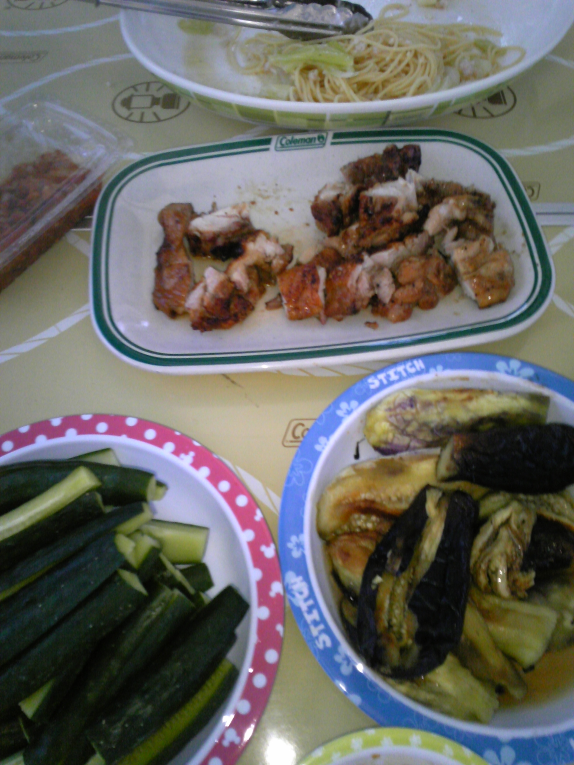 蟹とアスパラのパスタ・焼きナス・チキンソテー・イカの一夜干し・きゅうり