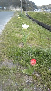 今年は家の前の川の土手にチューリップを植えました。
