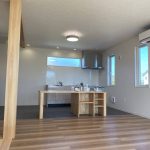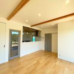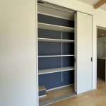 LDKは腰壁プラス白のクロスですっきりとさせることにより、シルバーのシステムキッチンが強調されています。またリビングから間続きの和室は襖の開閉によって使い方を選べるように設計し壁には珪藻土を使用しました。その和室には来客用のお布団と収納の確保のために納戸を設けました。
