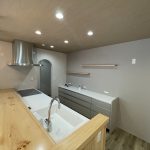 二階の子世帯は無垢の木の木目を生かしたナチュラルでシンプルな雰囲気に仕上げ、ステンレスのシステムオープンキッチンを使用してモダンさをプラスし、天窓からは光を取り入れております。壁は腰壁プラス稚内産珪藻土(白)を使用し、各部屋で塗り方を変えました。(3パターン)