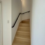 グレーを基調とした内装で、一階は白を取り入れ明るいモノトーンに、二階は黒を取り入れスタイリッシュに仕上げました。梁や造作は有色で塗装し、室内の雰囲気にまとまりを持たせました。階段には上下に光が拡散する照明を採用し、おしゃれな内装となっています。高気密高断熱の住宅性能と太陽光パネルで省エネルギーを実現しました。
