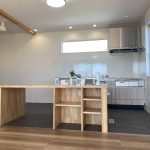 LDKには幅2メートルの造作ダイニングテーブルを設け、足元には可動棚の収納をプラス。用途に合わせて柔軟に使える工夫を施しました。