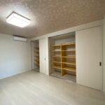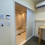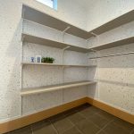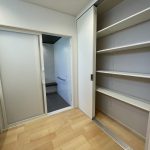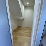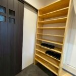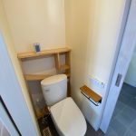 2つの居室の間には大型のウォークインクローゼットを配置し、どちらの部屋からも出入りできる便利な間取りに。お手洗いには造作のオープン収納を設け、実用性の中に遊び心を取り入れています。