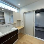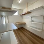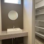 ランドリールームを設置し、居住空間に生活感を出さないようにしました。玄関からシューズクローク、パントリーに抜ける動線で生活しやすい空間となっています。
