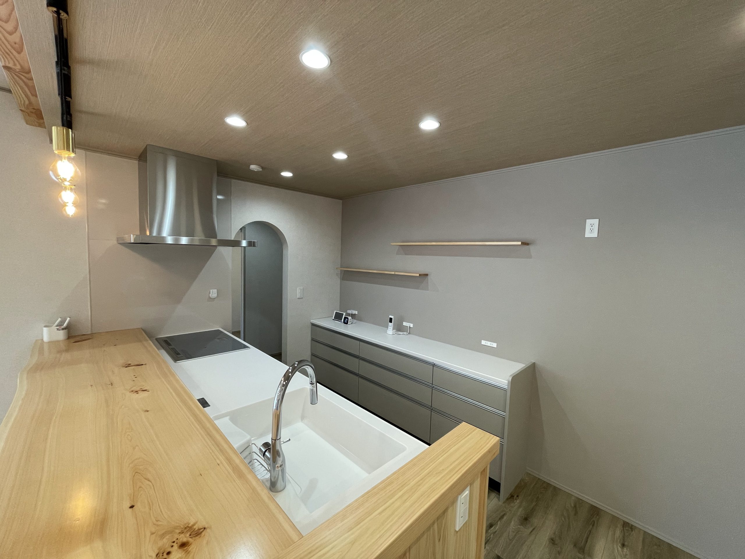 無垢の一枚板のカウンターを生かしたカウンターキッチン。