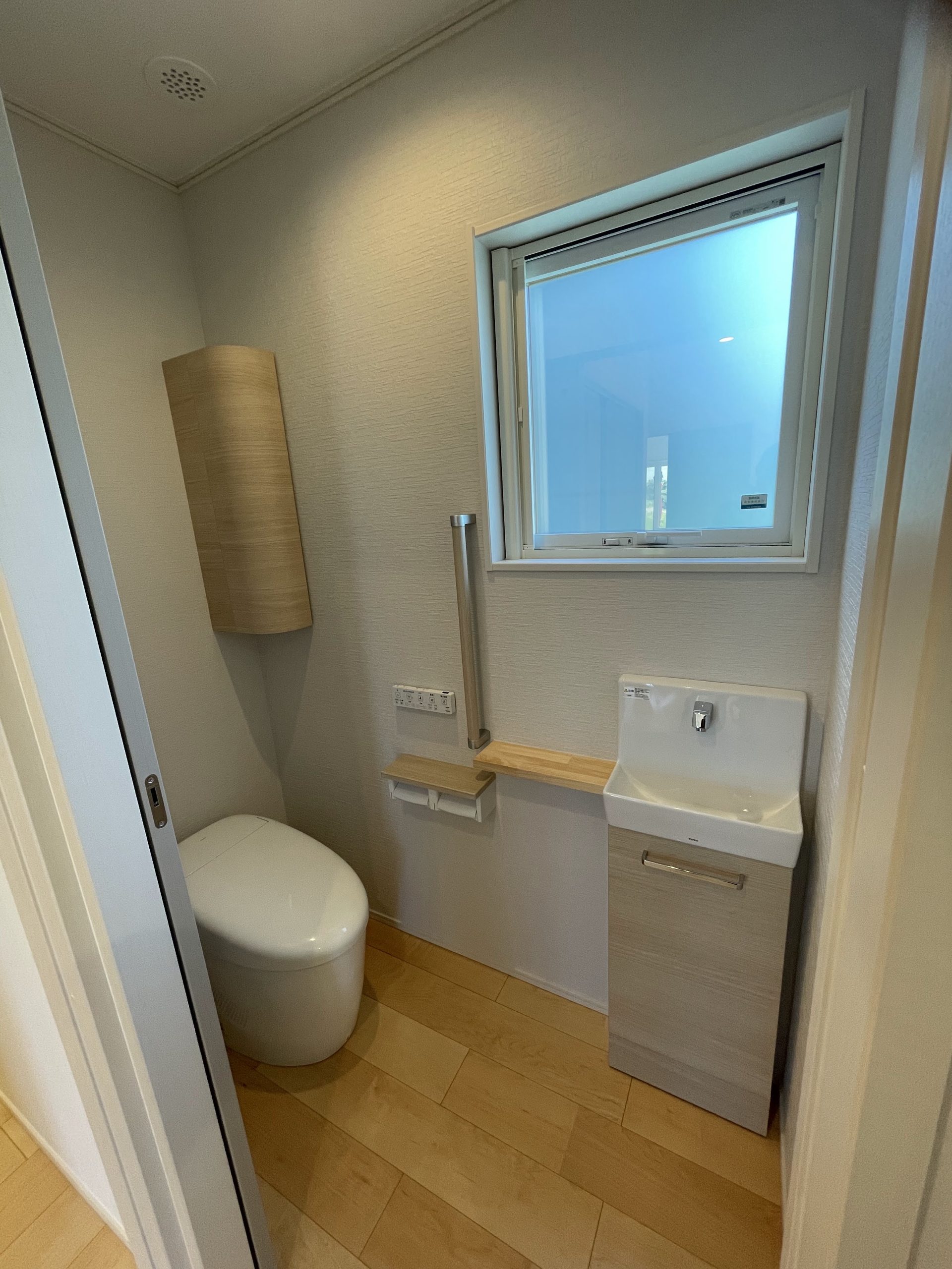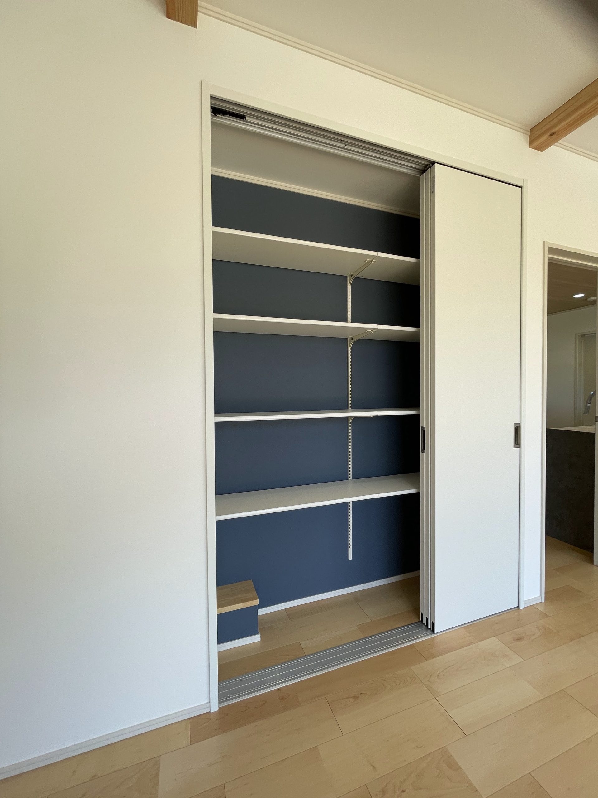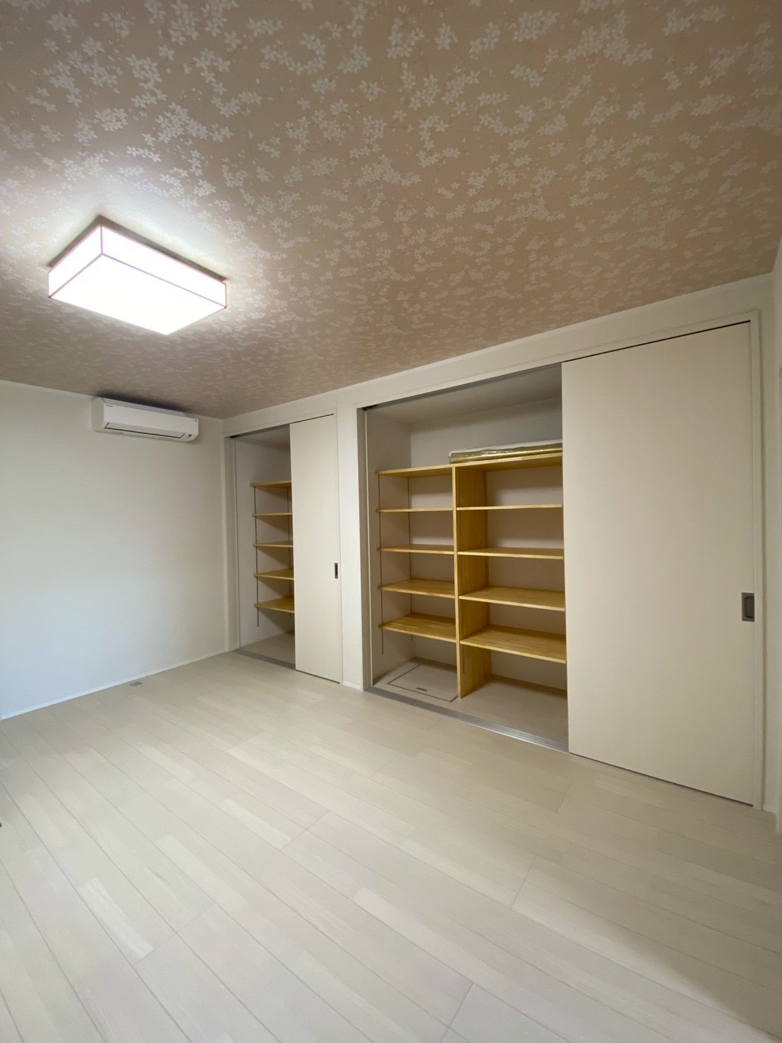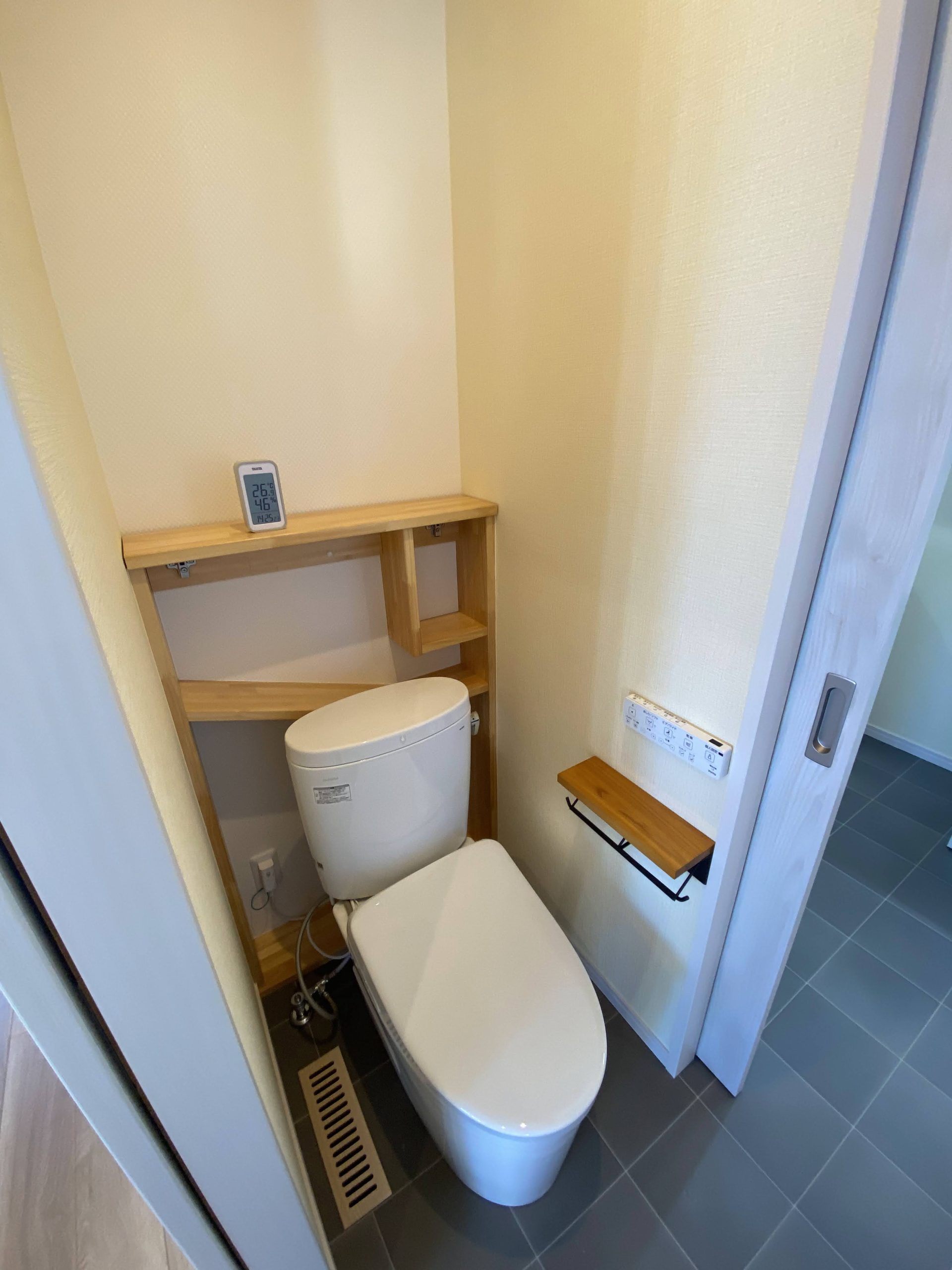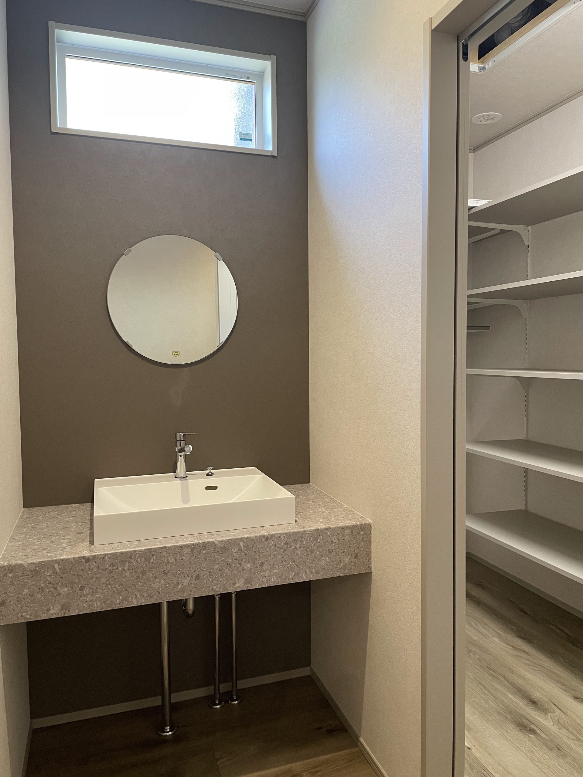 2つの居室の間には大型のウォークインクローゼットを配置し、どちらの部屋からも出入りできる便利な間取りに。お手洗いには造作のオープン収納を設け、実用性の中に遊び心を取り入れています。
