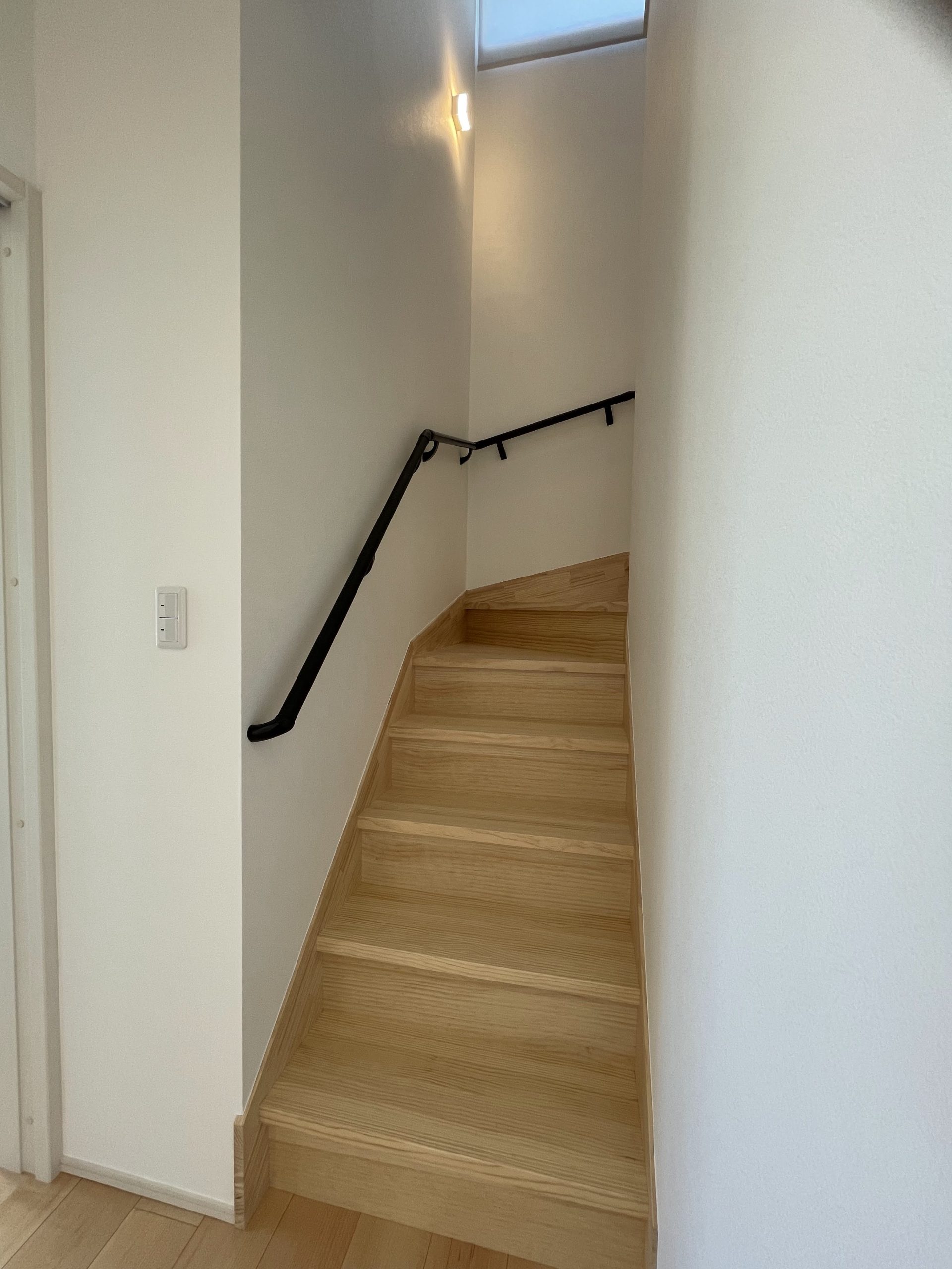 グレーを基調とした内装で、一階は白を取り入れ明るいモノトーンに、二階は黒を取り入れスタイリッシュに仕上げました。梁や造作は有色で塗装し、室内の雰囲気にまとまりを持たせました。階段には上下に光が拡散する照明を採用し、おしゃれな内装となっています。高気密高断熱の住宅性能と太陽光パネルで省エネルギーを実現しました。