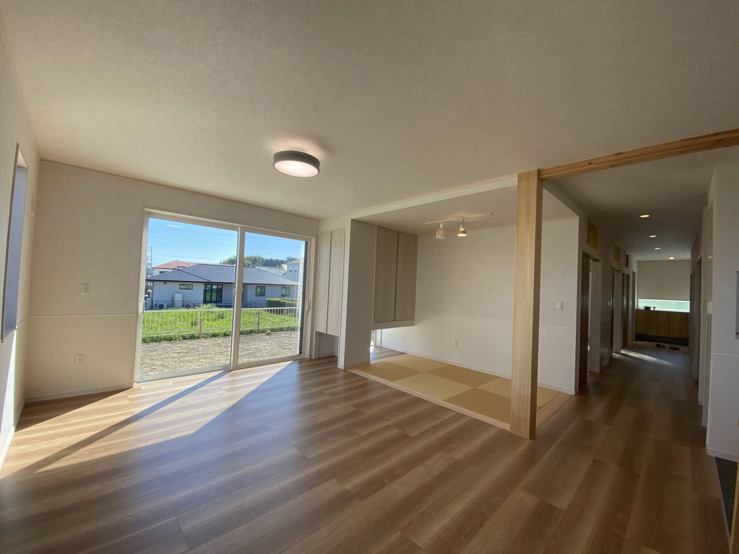 室内の間仕切りを減らして玄関からリビング、畳コーナー、パントリーまで見渡せるこの家の解放感は格別。自然と家族の目線が合いやすく、思わず笑顔が溢れます!平屋とは思えないほどの収納力も見どころです。