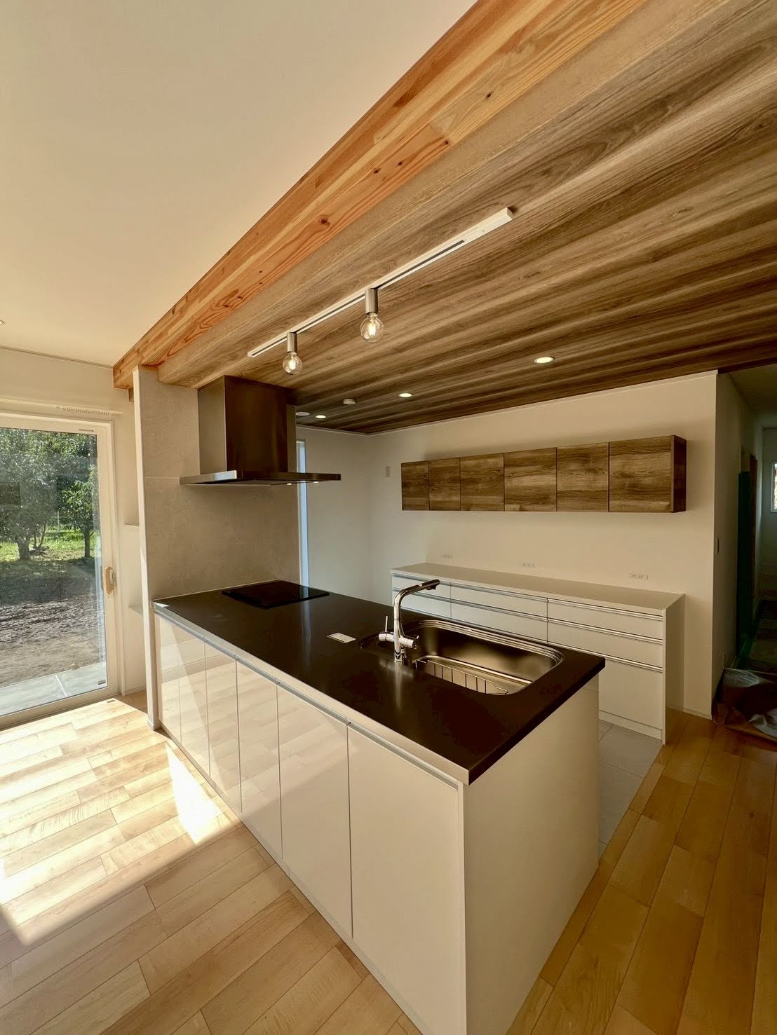 二階の子世帯は無垢の木の木目を生かしたナチュラルでシンプルな雰囲気に仕上げ、ステンレスのシステムオープンキッチンを使用してモダンさをプラスし、天窓からは光を取り入れております。壁は腰壁プラス稚内産珪藻土(白)を使用し、各部屋で塗り方を変えました。(3パターン)