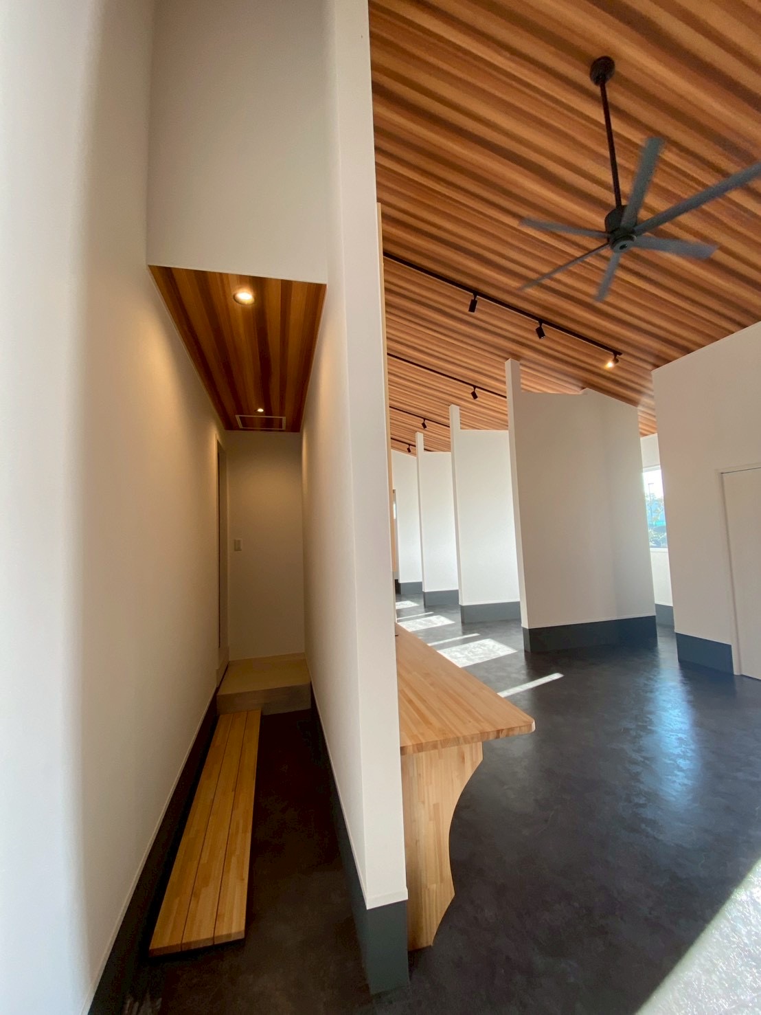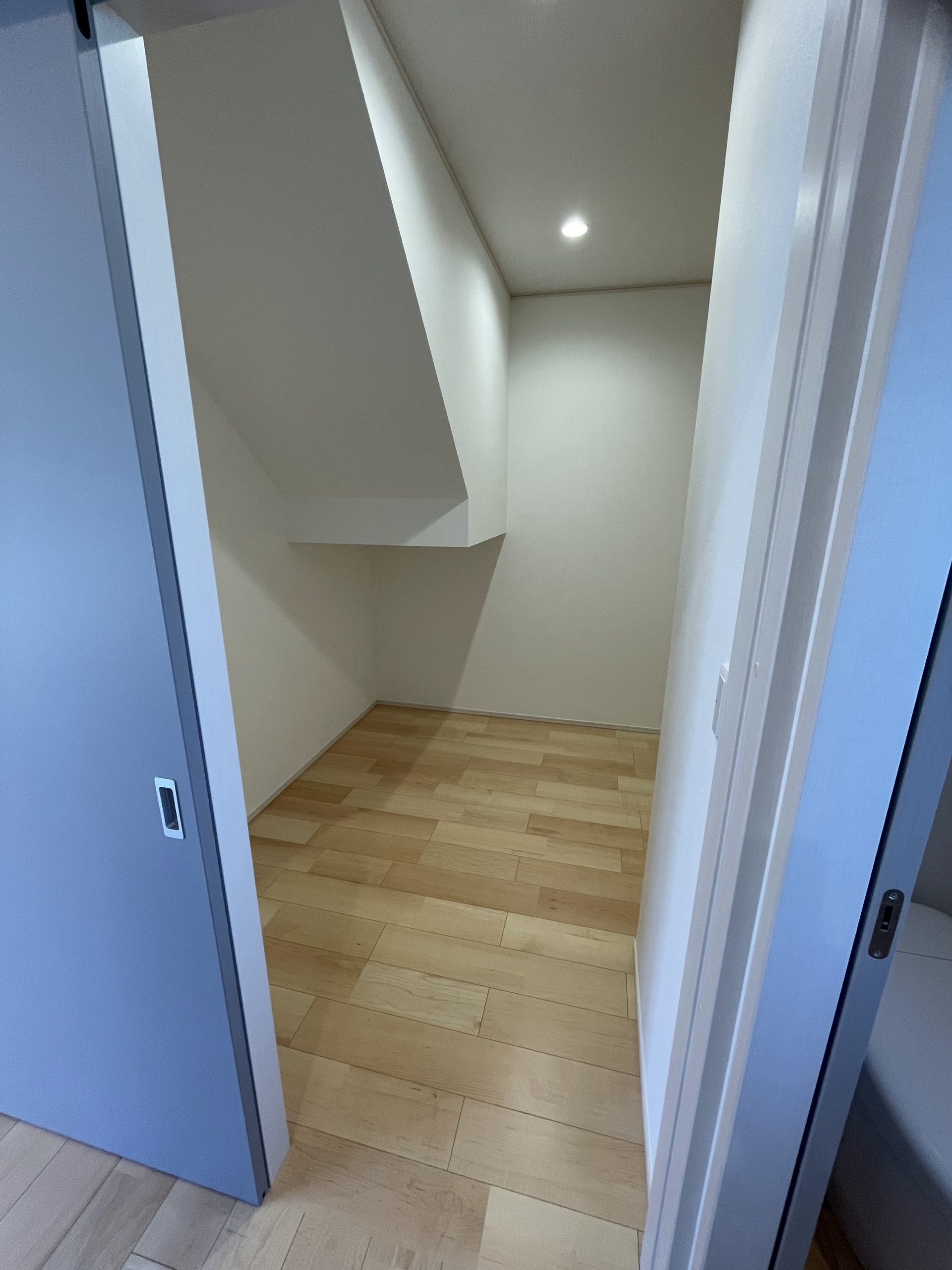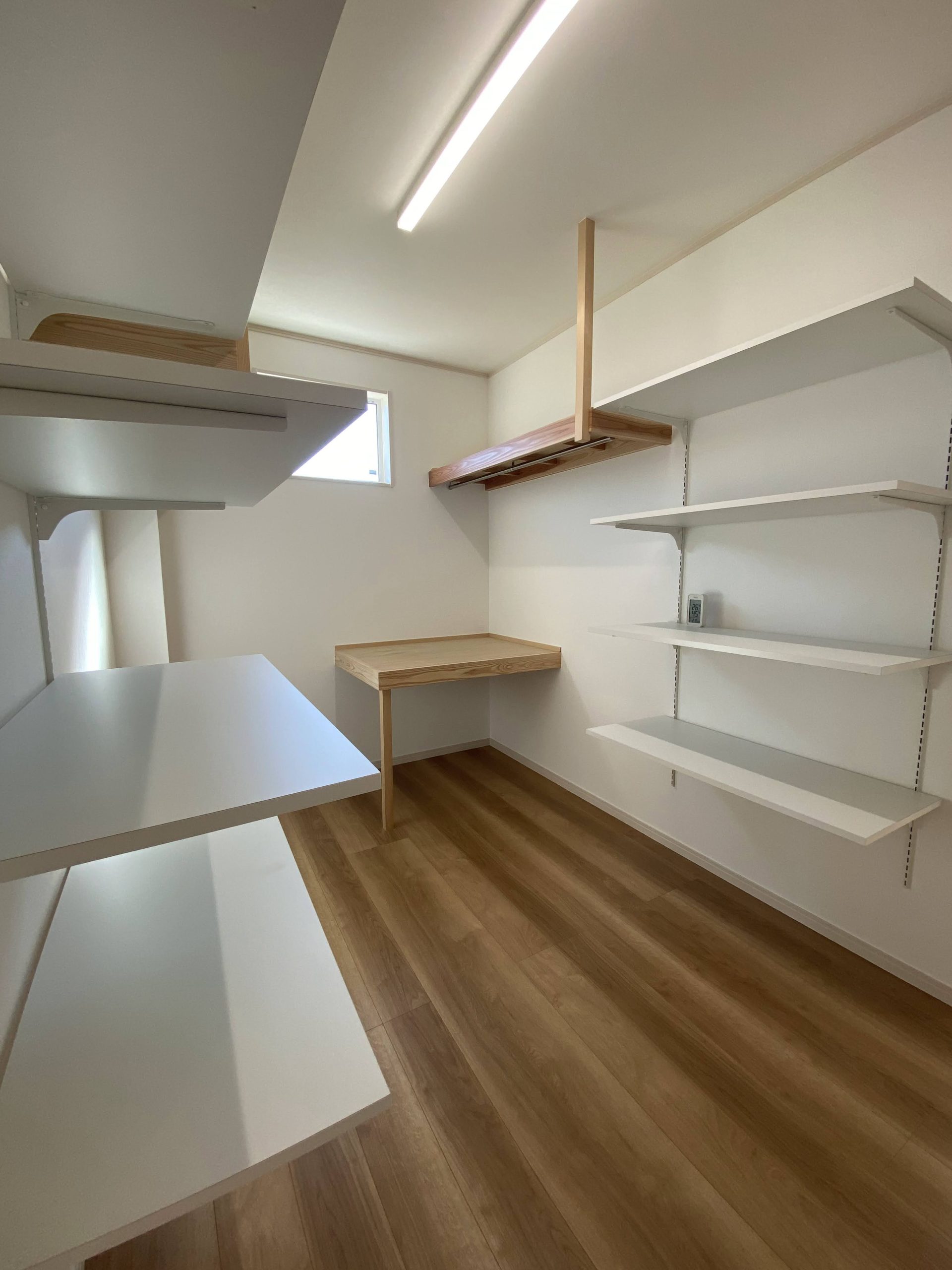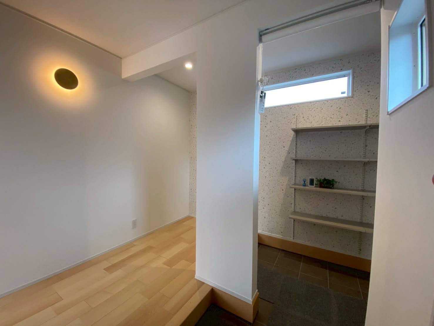 ウォークインの足元に窓を設置し、明かりが取り込める設計となっております。間仕切りで稽古部屋を設けており、仕事場も兼ねたお家になります。