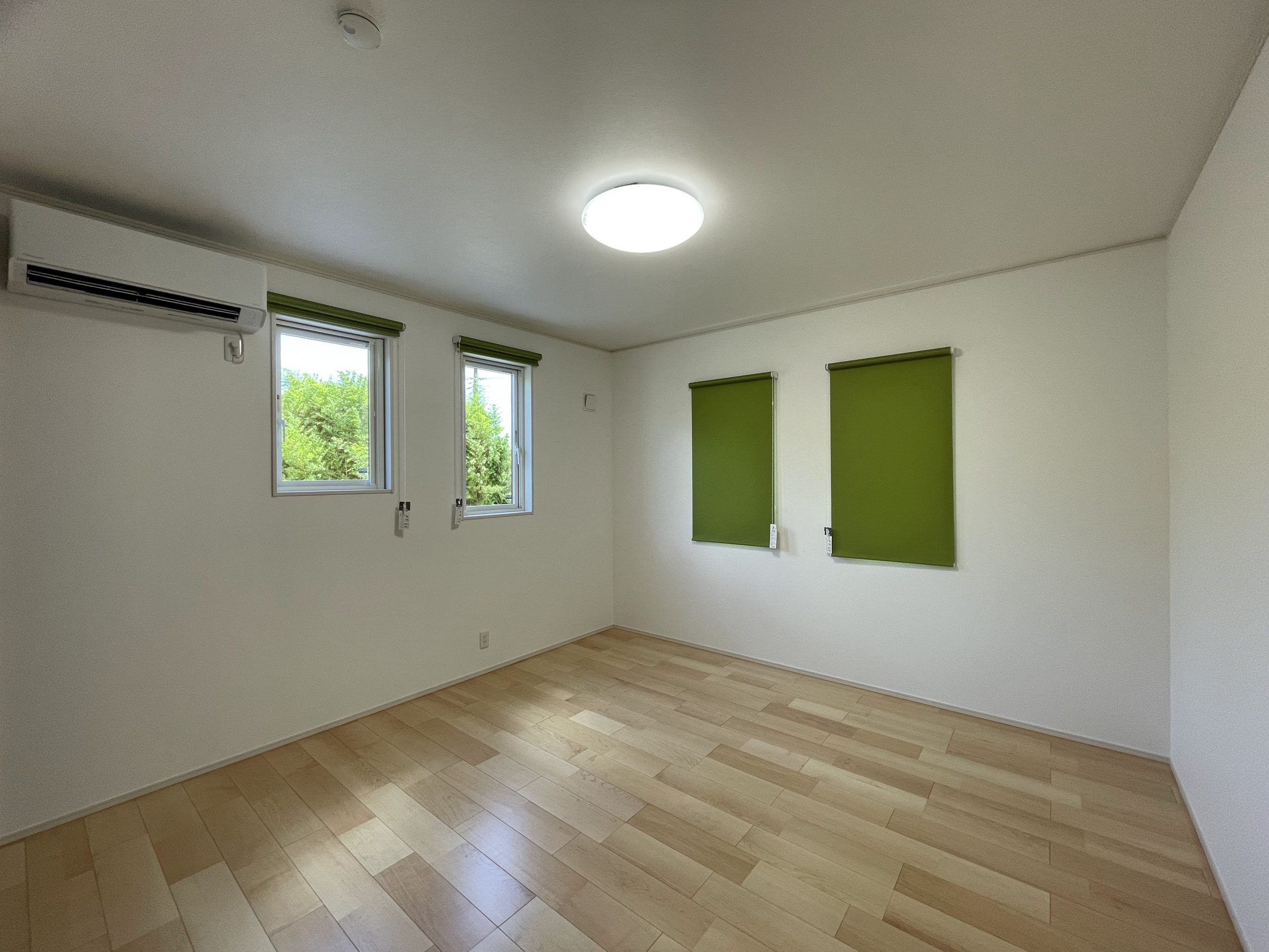 YAMAHAのグリーンのキッチンを使用することによって、白と無垢パインフロアの室内にアクセントをいれ明るい印象となっております。