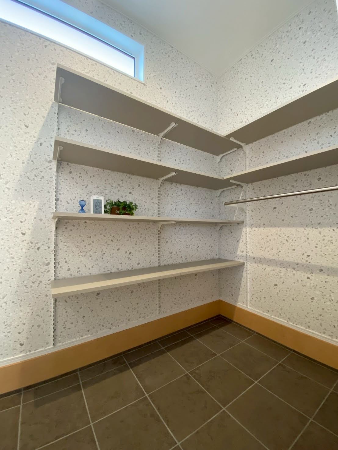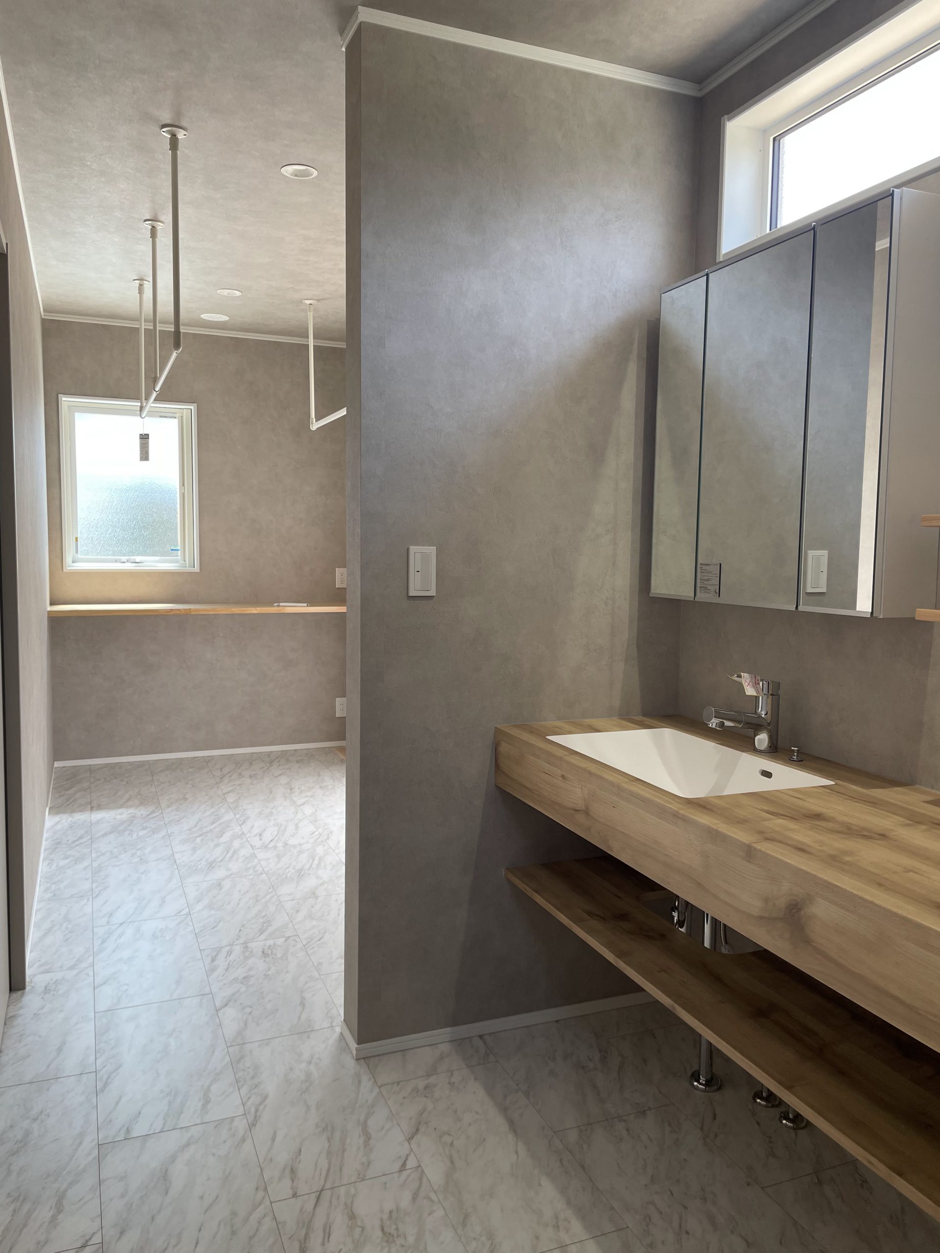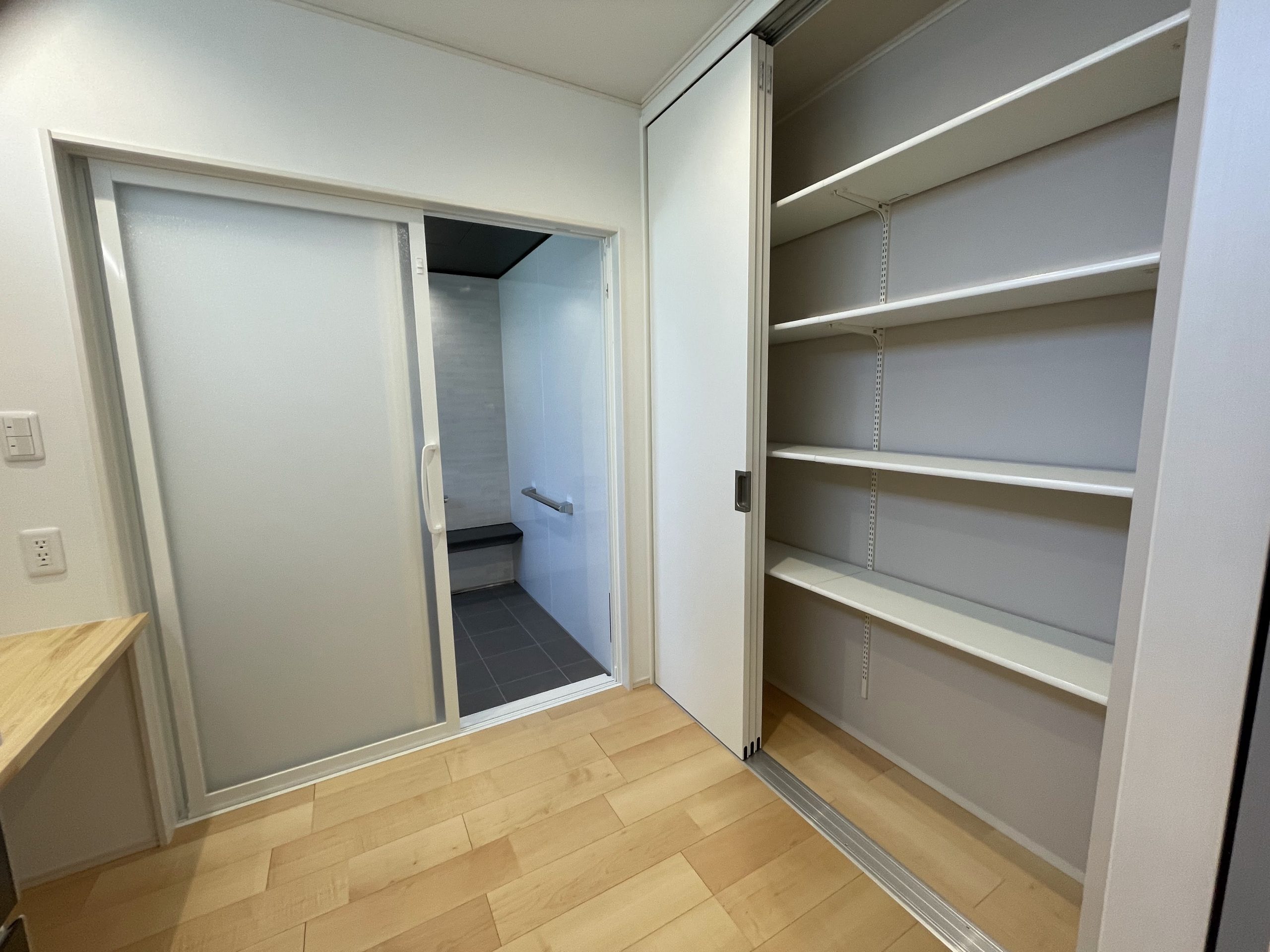 ランドリールームを設置し、居住空間に生活感を出さないようにしました。玄関からシューズクローク、パントリーに抜ける動線で生活しやすい空間となっています。