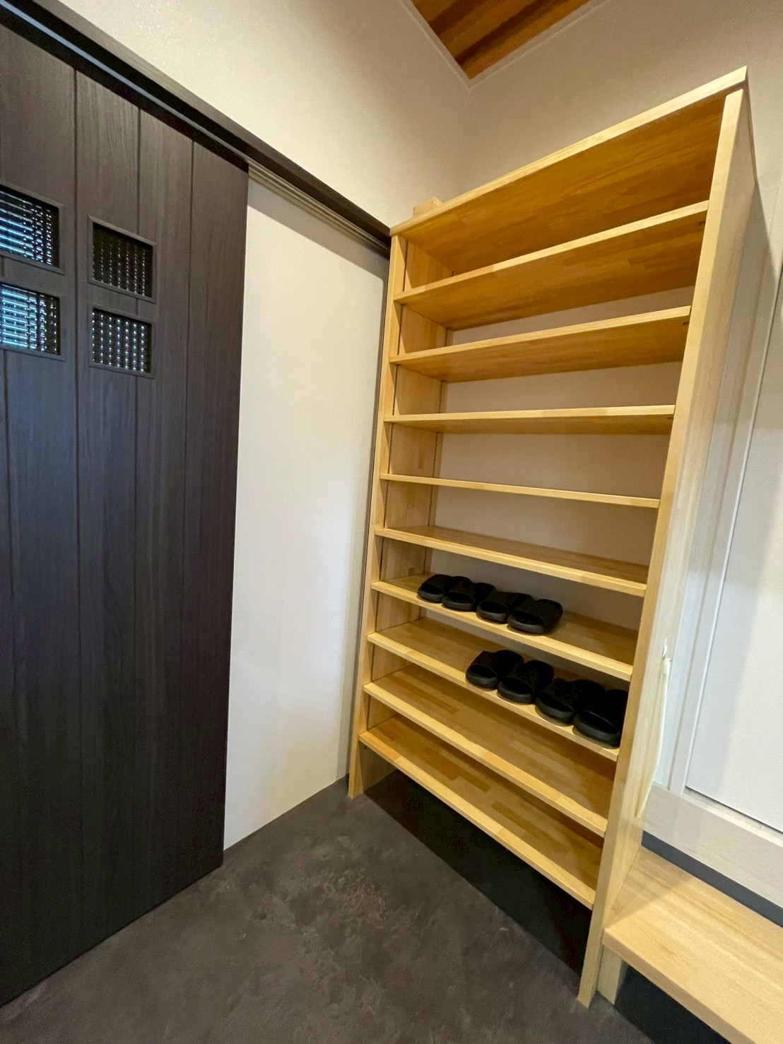 何かと物に溢れるリビング横に4畳の納戸を設けて収納に配慮し、玄関内は急な来客にも慌てなくて済むようにシューズクローゼットを設けて来客用とプライベート用二箇所の上がり口にしました。