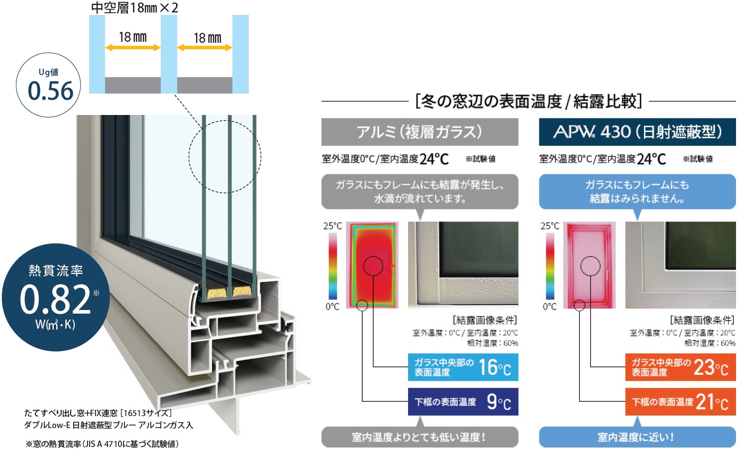 2枚のLow-Eガラスで挟んだ総厚45ミリ(※)のトリプルガラス。アルゴンガス入の中空層が16ミリから18ミリに増え、断熱性能が5%アップしました。室内の暖かな空気と窓の表面温度の差を小さくし、結露を防ぎます。室内側のガラスやフレームに触れても、ヒヤリとするような冷たさを感じません。冷暖房を効率よく使用することができるので、1 年中快適です。
